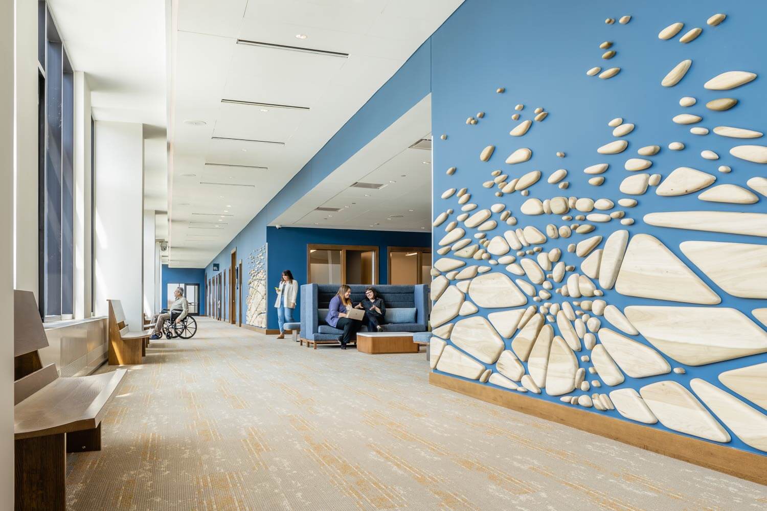 Materials are selected for their durability, maintainability, dignity, biophilic, and sustainable qualities.
