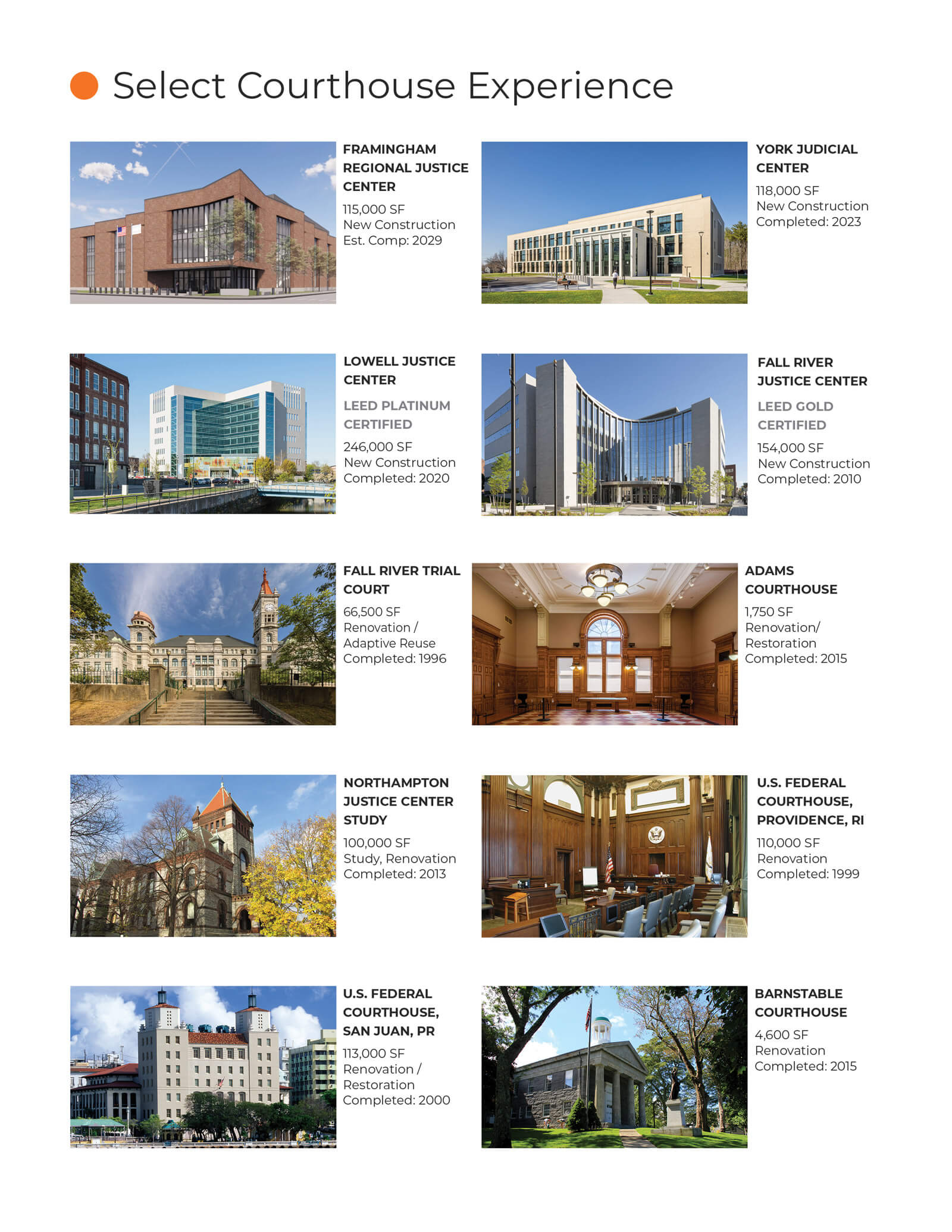 "The Fall River Justice Center project came in on-time and on-budget, and has resulted in a highly functional and efficient courthouse as well as a great civic presence and focal point for Main Street in Fall River. The design is simple, elegant and well-detailed, is easy to maintain and looks as good today as it did when it was completed."